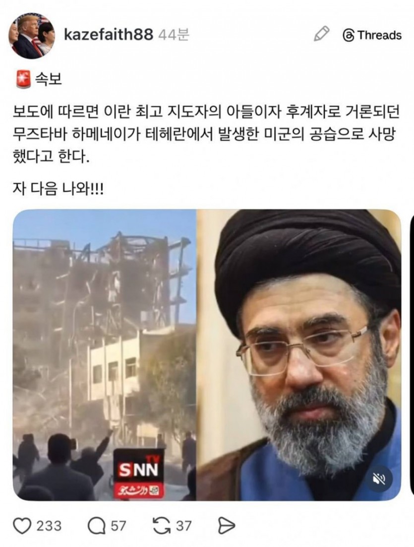 (속보) 하메네이 아들 사망 작성자 정보 81b20880 작성 작성일 2026.03.04 21:14 컨텐츠 정보 345 조회 0 추천 0 비추천 목록 본문 사망.. 0 추천 0 비추천 SNS 공유 관련자료 이전 BTS 공연 앞두고 갤럭시 대여 증가 작성일 2026.03.20 21:58 다음 속보) 이란 미친 사우디 아람코 시설 공격 ㄷㄷㄷ 작성일 2026.03.02 17:37 댓글 0 등록된 댓글이 없습니다. 로그인한 회원만 댓글 등록이 가능합니다. 목록